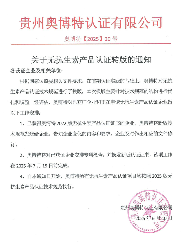 關(guān)于無抗生素產(chǎn)品認(rèn)證轉(zhuǎn)版通知